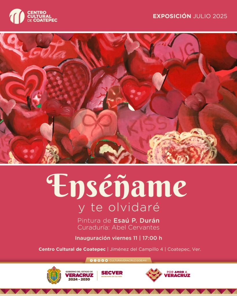 Xalapa, Ver., miércoles 09 de julio de 2025.- La Secretaría de Cultura de Veracruz (SECVER) invita a la inauguración de la exposición Enséñame y te olvidaré, este viernes 11 a las 17:00 horas en el Centro Cultural de Coatepec, cuyo acceso es gratuito.