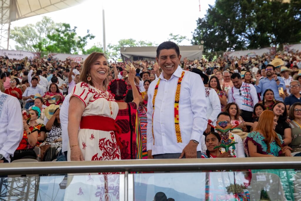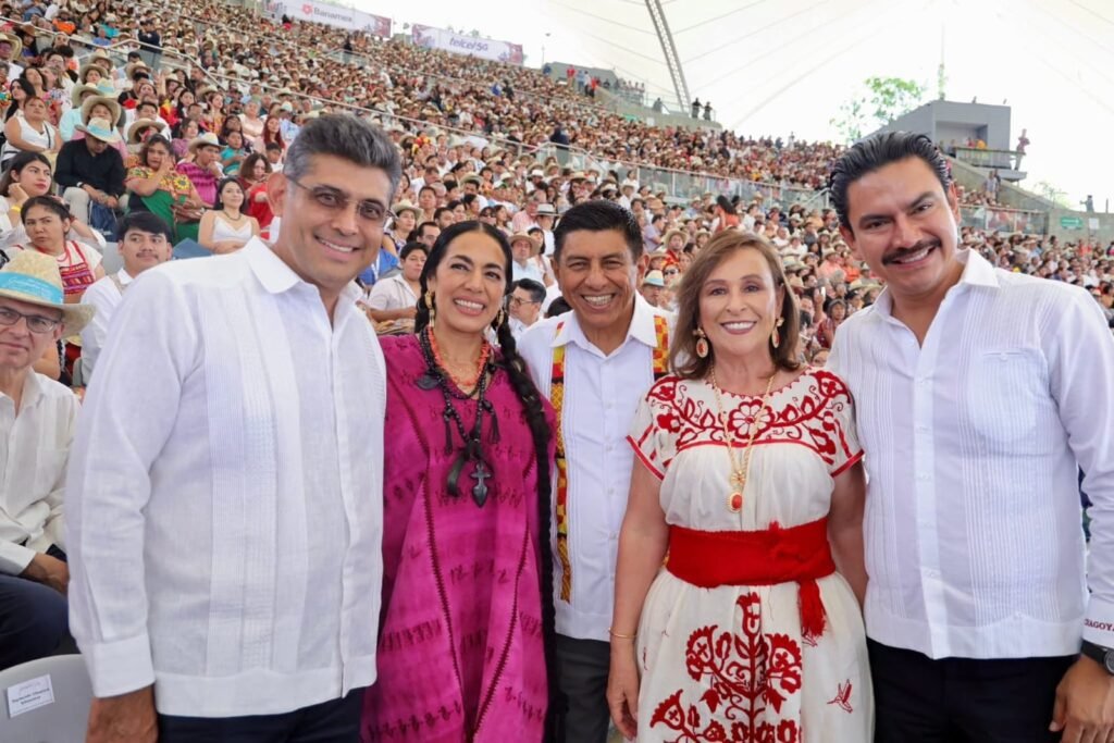 Oaxaca, Oax., lunes 21 de julio de 2025. – La gobernadora Rocío Nahle García, asistió como invitada especial a la tradicional ceremonia matutina del Lunes del Cerro, celebrada en el Auditorio de la Guelaguetza, donde acompañó al gobernador de Oaxaca, Salomón Jara Cruz, y a la presidenta honoraria del DIF estatal, Irma Bolaños Quijano, en la máxima fiesta de interculturalidad de América Latina.