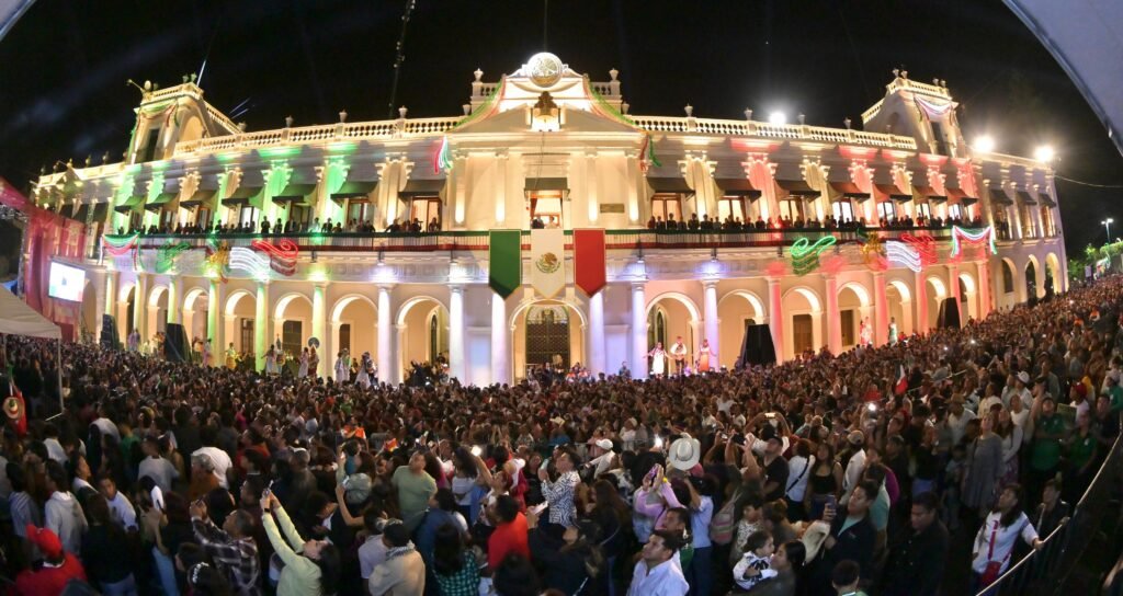 Ataviada con un elegante traje típico de jarocha, confeccionado en Tlacotalpan, la Gobernadora salió al balcón principal alrededor de las 23:09 horas. Con gesto solemne hizo ondear el Lábaro Patrio y, en medio del júbilo colectivo, lanzó 13 vibrantes arengas que fueron coreadas con fuerza por la multitud, en conmemoración del 215 aniversario del inicio de la gesta por la libertad y la justicia de México.