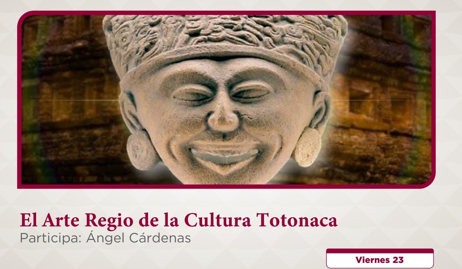 Xalapa, Ver., martes 20 de enero de 2026.- La Secretaría de Cultura de Veracruz (SECVER) invita al público en general a participar en la conferencia El Arte Regio de la Cultura Totonaca, el próximo viernes 23 de enero, a las 18:00 horas, en las instalaciones del Museo Teodoro Cano, de Papantla. La entrada es libre.