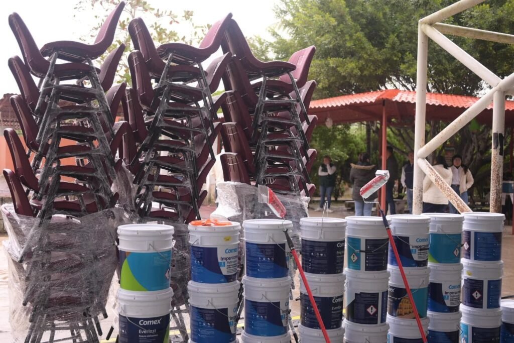 En total, 15 secundarias de Poza Rica recibieron 2 mil 257 kits escolares, mil 421 sillas, 710 mesas, 183 cubetas de impermeabilizante, 131 cubetas de pintura de 19 litros, 113 pizarrones, 47 pantallas de 55 pulgadas para 11 telesecundarias, así como 30 brochas y 30 rodillos, destinados al mejoramiento de las condiciones de los planteles.