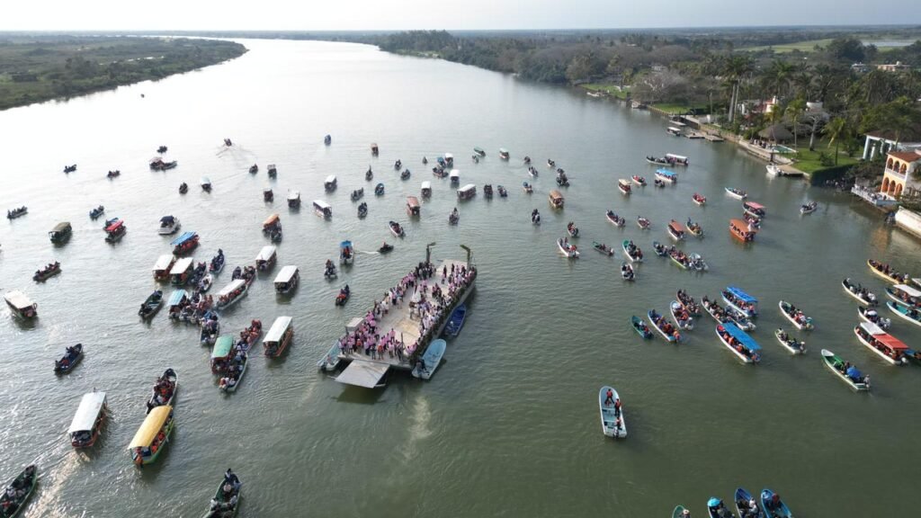 Tlacotalpan, Ver., lunes 02 de febrero de 2026.– La gobernadora Rocío Nahle García presenció, desde el Centro Cultural del Sotavento, el tradicional recorrido de la Virgen de La Candelaria por el río de Las Mariposas, uno de los rituales religiosos y culturales más emblemáticos del estado y símbolo vivo de la identidad tlacotalpeña.