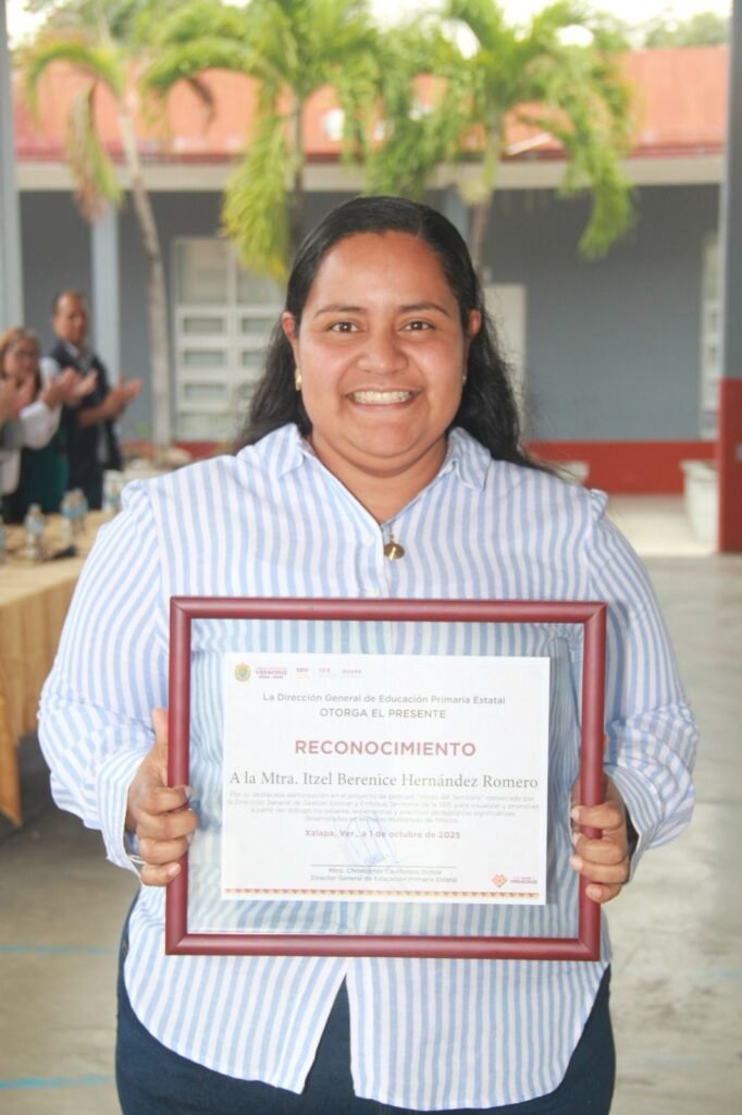 Soledad de Doblado, Ver., jueves 05 de febrero de 2026.- La Secretaría de Educación de Veracruz (SEV), a través de la Dirección General de Educación Primaria Estatal, otorgó un reconocimiento a la maestra Itzel Berenice Hernández Romero, adscrita a la Escuela Primaria Guillermo Prieto, ubicada en la localidad de Los Teteles, por su destacada participación en el podcast Voces del Territorio.